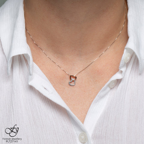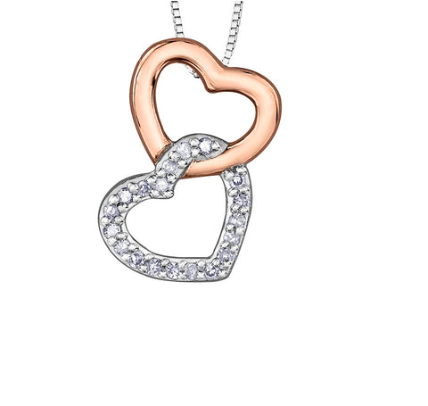 When two hearts become one. Rose gold and White gold hearts interwind in this elegant diamond pendant. It comes with an 18-inch complimentary chain.