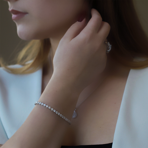 A classic tennis bracelet crafted in 10kt white gold. This stunning diamond bracelet features 5.00cttw of lab-created diamonds. The perfect addition to your holiday outfits.