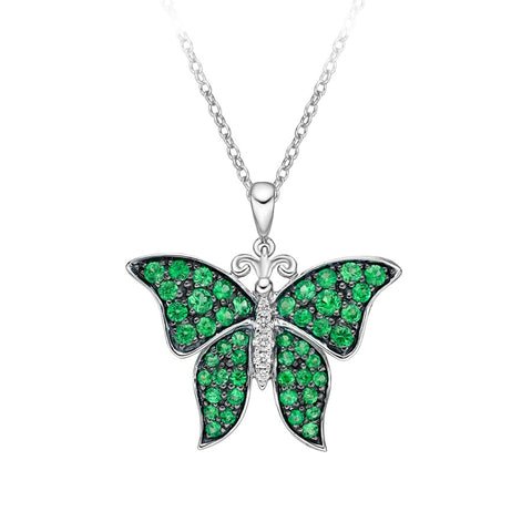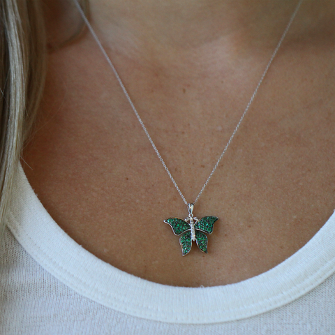 Anyone's heart will flutter at this pendant's sight. The pendant holds beautiful emeralds inside the butterflies body and diamonds along its center. It comes with an 18-inch complimentary chain