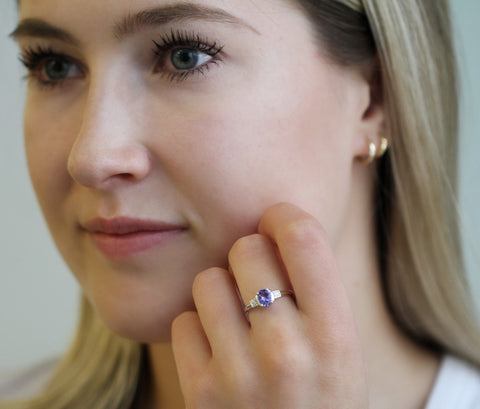 This ring is far from subtle--it stands out with a bold design that is echoed in the two diamond accents that adorn either side of the center tanzanite. The face of the tanzanite is accentuated by the surrounding white gold.