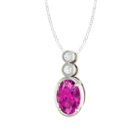 Radiating elegance and timelessness, this 10kt white gold pendant showcases an oval-cut pink tourmaline center adorned by two round diamonds. This beautiful pendant makes a thoughtful gift for anyone and comes with a complementary 18-inch chain. Complete the set with matching earrings for a coordinated and sophisticated look.