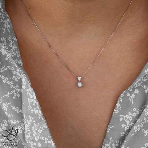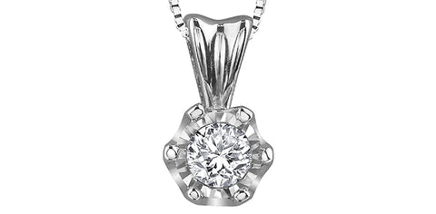 This simple and elegant pendant lets the diamond speak for itself. This pendant features a round diamond wrapped in 10kt white gold. It also comes with an 18-inch complimentary chain.