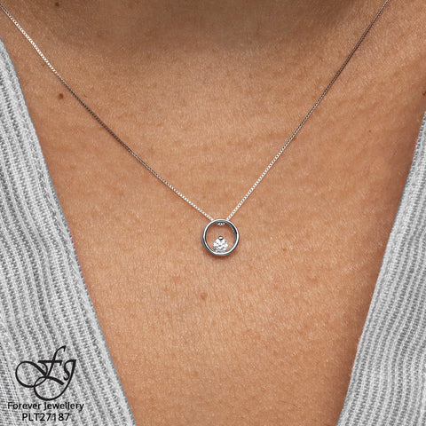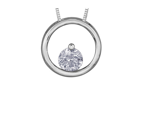 This simple and elegant pendant lets the diamond speak for itself. This pendant features a round diamond in the center of the 10kt white gold circle pendant. It also comes with an 18-inch complimentary chain.