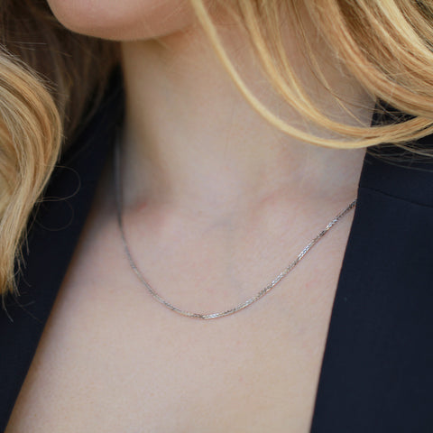 10kt white gold square wheat chain 16 inches long. This classic chain will be perfect to wear on its own or while holding a pendant.