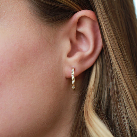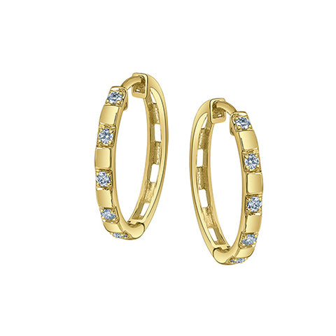 Classic hoop earrings crafted in 10kt yellow gold. Each earring features five round diamonds, for a total of 0.20cttw of certified Canadian diamonds.