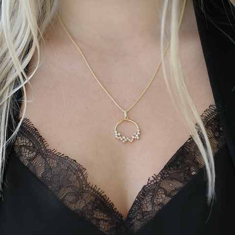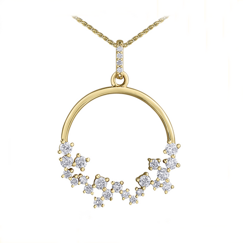 10kt yellow gold pendant with an elegant open circle design featuring round, shimmering diamonds. This is the perfect pendant for everyday wear or any special occasion, either way, it will quickly become a loved piece in her collection.