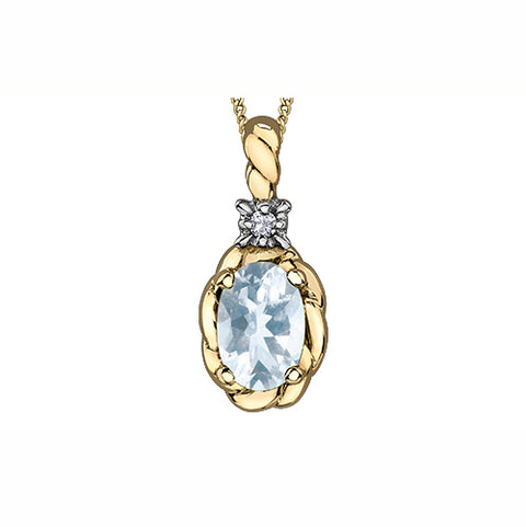 A beautiful aquamarine sparkles at the front and center of this oval pendant. It is topped with a delicate diamond and hangs on a complementary yellow gold chain.