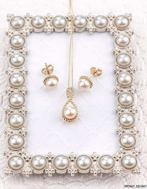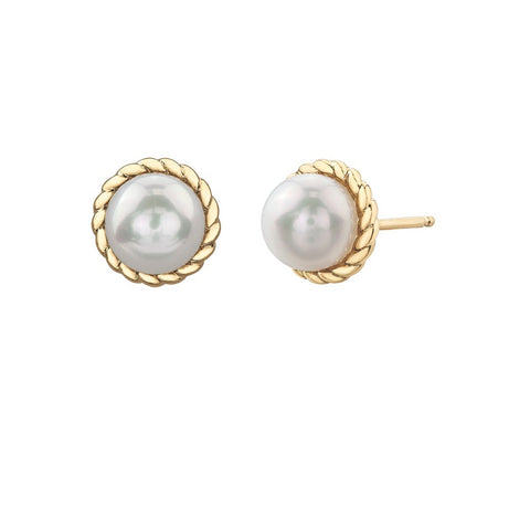 Delicate 10kt yellow gold rope detailing wrap luminous 6mm pearl, creating a slight twist on classic pearl stud earrings. A true treasure to add to your collection.