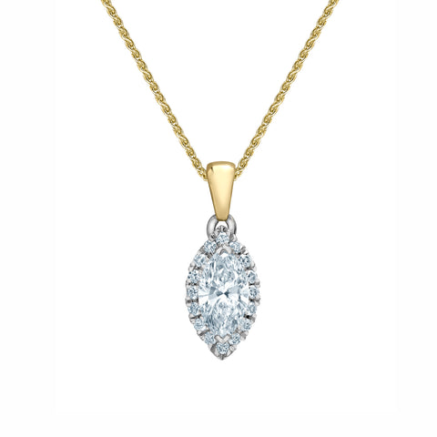 A stunning and unique marquise cut lab-created diamond is surrounded by a halo of round diamonds making a total of 0.90cttw of lab-grow diamonds on this pendant. Crafted from 14kt yellow and white gold, with a 0.74ct center stone.