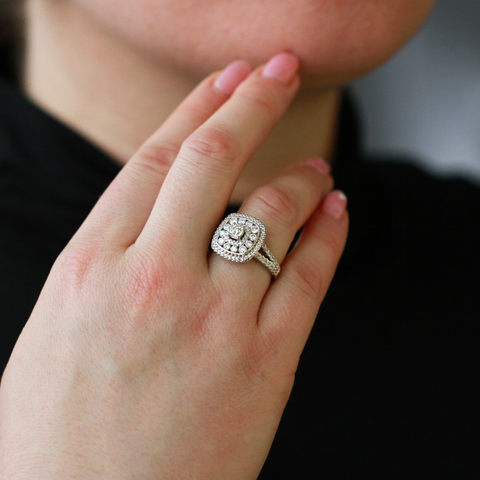 14kt white gold ring, with a glimmering, pave setting on a shank that splits at the head of the ring. A cushion cut center diamond is propped up in a basket head and surrounded by a detailed triple halo of smaller and larger, round cut diamonds, creating an attention-grabbing, spectacularly sparkling ring. The center diamond is a certified Canadian stone.