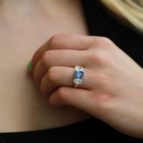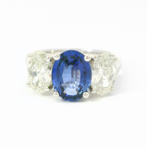 Embrace the beauty of timeless elegance with this exquisite 18kt White Gold Three-Stone Ring, featuring a stunning 2.02ct oval sapphire at its center. Flanking the sapphire are two sparkling diamonds, one on each side, creating a harmonious balance that symbolizes the past, present, and future of your love story.