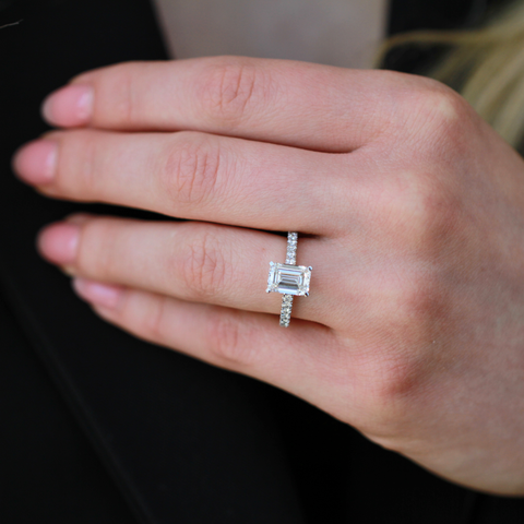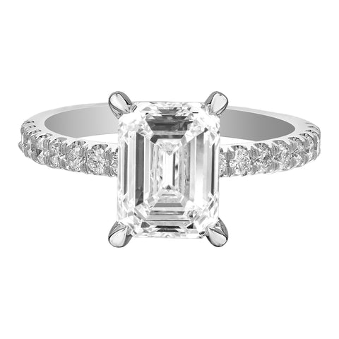 Classic and timeless 2.40cttw lab-grown emerald cut diamond ring set on a glistening pave band. Crafted from 14kt white gold this ring will stand the test of time.