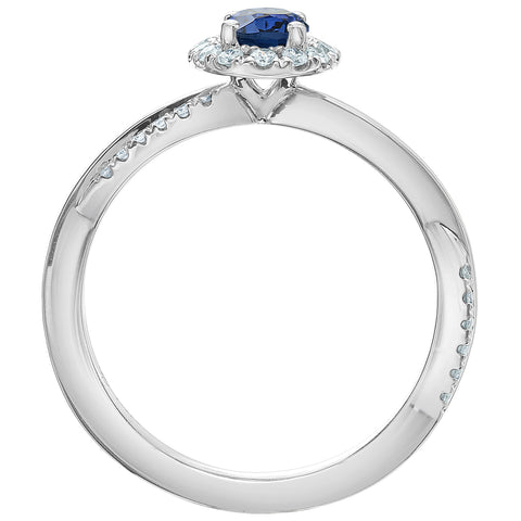 Elegant and timeless white gold ring featuring a fresh and eye-catching lab-grown sapphire center surrounded by a halo of shimmering diamonds. Celebrate those born in September with this breathtaking ring featuring their birthstone, sapphire. Makes for a thoughtful gift for anyone.