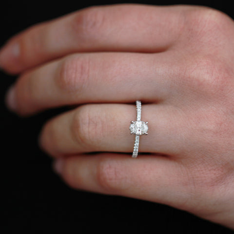 Introducing a stunning 0.78cttw, 14kt white gold engagement ring. At its heart is a dazzling 0.51ct Canadian diamond, elegantly showcased in a secret halo setting that enhances its brilliance and sparkle. The ring is beautifully complemented by pave-set shoulders, adding a touch of sophistication and romance to the design. This exquisite piece is the perfect symbol of love and commitment, combining timeless elegance with modern flair.