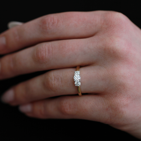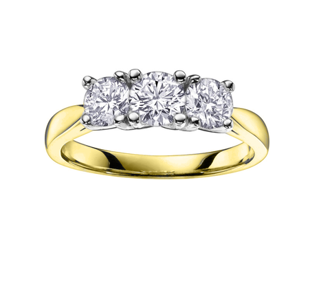 Beautiful and elegant 0.75cttw three-diamond ring crafted in brilliant 14kt yellow and white gold. Celebrate the past, present, and future. Makes for the perfect gift for that special someone.