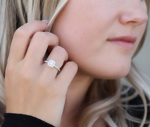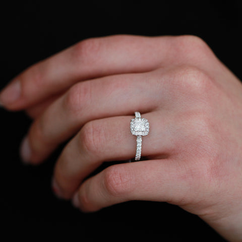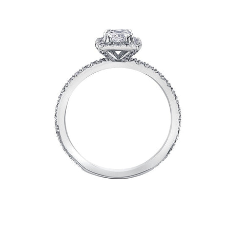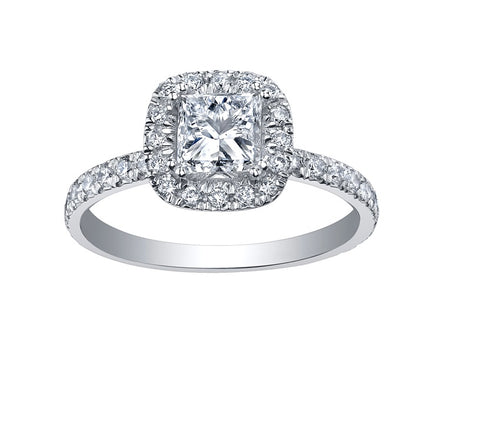 This ring is anything short of magnificent. Crafted from brilliant 14kt white gold showcasing a dazzling 0.51ct Canadian princess cut center diamond surrounded by a halo of glistening diamonds. With 1.01cttw of shimmering diamonds, she will never want to take this ring off.