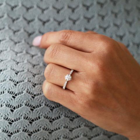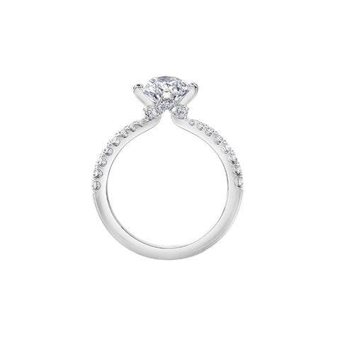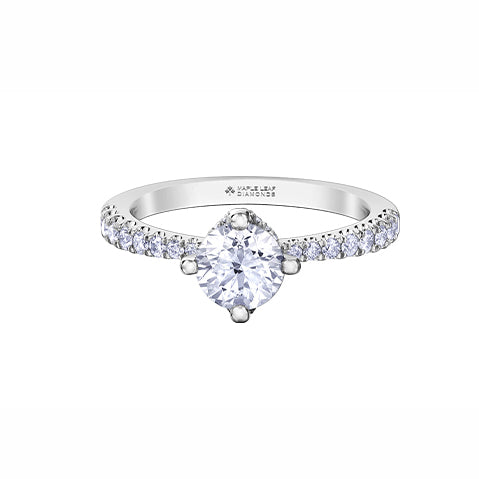 This certified Canadian diamond engagement ring features a dazzling 0.73ct round diamond. Pave diamonds line the band, starting small and getting larger as they get further from the center stone. The basket also features diamond detailing that is seen from the side.