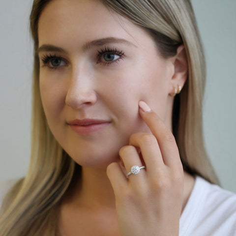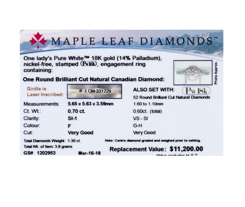 Crafted in 18kt white Canadian Certified Gold this stunning 1.30cttw engagement ring features a beautiful 0.70ct round brilliant cut diamond surrounded by a halo of shimmering diamonds.