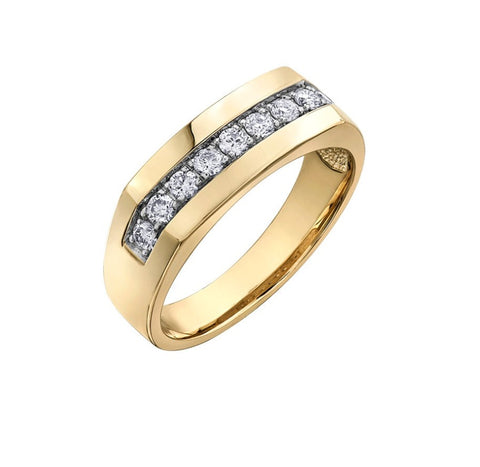 When it comes to the finer things in life like jewelry, one cannot be too selective. This ring is a perfect example of a wedding band that is a symbol of everlasting love and commitment. This 10kt yellow gold ring with a center row of diamonds is set in a high polished band is set to stand the test of time.