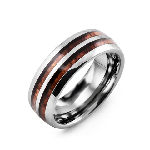 Chic, cool, and contemporary, this Double Koa Wood Row Tungsten Wedding Band will add colour and character to every jewellery collection. A fabulous piece of jewellery for brides and grooms looking for a modern alternative to the traditional wedding ring, it features a stylish tungsten band set with two rows of richly coloured Koa wood from the islands of Hawaii.